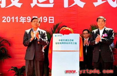 天津市委副書記、濱海新區區委書記何立峰和國家電網公司副總經理、黨組成員欒軍共同為中新天津生態城智能電網綜合示范工程投運揭牌。中新天津生態城智能電網綜合示范工程是天津智能電網建設發展的標志性工程。此工程遵循“可實行、可復制、可推廣”的規劃思路,努力構建安全可靠、優質清潔、高效互動的能源供應體系和服務體系。該工程投運后,不僅風電、光伏發電等可再生能源利用率可達到20%以上,而且電網能實現和有線電視、IP電話、互聯網的相互融合,其遙控、遙測、信息反饋的智能化能力可做到從居民生活到公共設施,再到工業生產的全涵蓋。