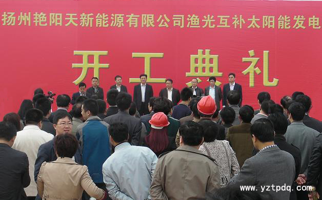 2014年4月18日,揚州艷陽天新能源有限公司漁光互補太陽能發電項目開工奠基儀式在寶應縣柳堡仁里蕩隆重舉行。寶應縣相關領導、上海新能源行業協會會長朱元昊、揚州艷陽天新能源有限公司負責人、柳堡各村(居)支部書記、各部門單位負責人、柳堡鎮機關全體干部等參加了開工奠基儀式。