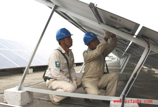 2014年9月16日,國網揚州市江都供電公司工作人員深入基層,來到“江蘇光伏賣電第一人”朱啟杰以及其他分布式光伏發電用戶,為他們解決光伏發電和并網中遇到的問題,促進江都分布式光伏發電產業的快速發展。目前,揚州市江都區有32家分布式光伏發電用戶申請并網,已經并網20家,其中企業為3家,個人為17家,并網總容量為310千瓦,在江蘇省各縣(市、區)名列前茅。圖為江都供電公司員工為揚州永力電子公司120千瓦分布式光伏發電裝置檢修線路。