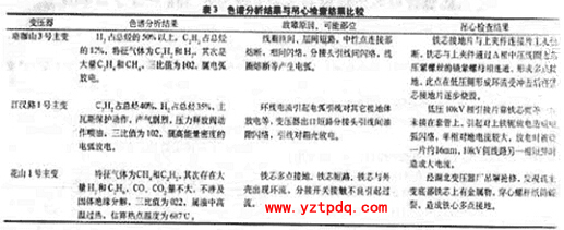 珞珈山3號主變、江漢路1號主變和花山1號主變的色譜分析結果、故障原因以及吊心檢查結果見表3。