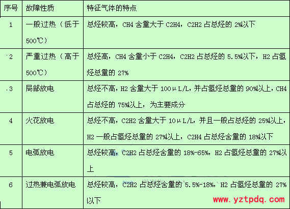從大量統計數據中可以看出,變壓器內部發生故障時產生的總烴中,各種氣體的比例在不斷變化,隨著故障點溫度的升高,CH4所占的比例逐漸減少,而C2H2和C2H6的比例逐漸增加,當達到電弧溫度時C2H2成為主要成分。可以用表2-1所列特征氣體的特點來判斷故障的性質。