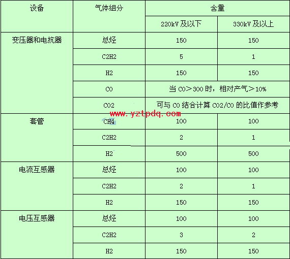 表2-2 對出廠和新投運的設備氣體含量的要求