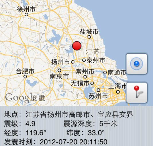據(jù)揚(yáng)州市地震臺(tái)網(wǎng)中心測(cè)定,2012年7月20日20時(shí)11分在揚(yáng)州高郵、寶應(yīng)交界(北緯33.0度,東經(jīng)119.6度)發(fā)生4.9級(jí)地震。