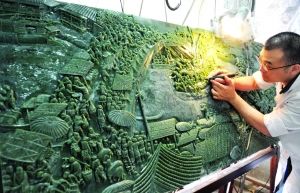 去年,揚州著名漆器點螺大師楊定國曾創作完成了首幅點螺漆畫《清明上河圖》。今年,繼剪紙長卷《清明上河圖》在中國剪紙博物館正式面世之后,揚州玉雕又給世人亮出了最震撼的一筆——碧玉《清明上河圖》插排。