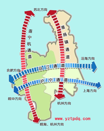 東部走廊新建五峰山過江通道、連淮揚鎮鐵路,加強兩市東部江都區、揚州生態科技新城、廣陵新城、大港、丹陽之間的聯系。